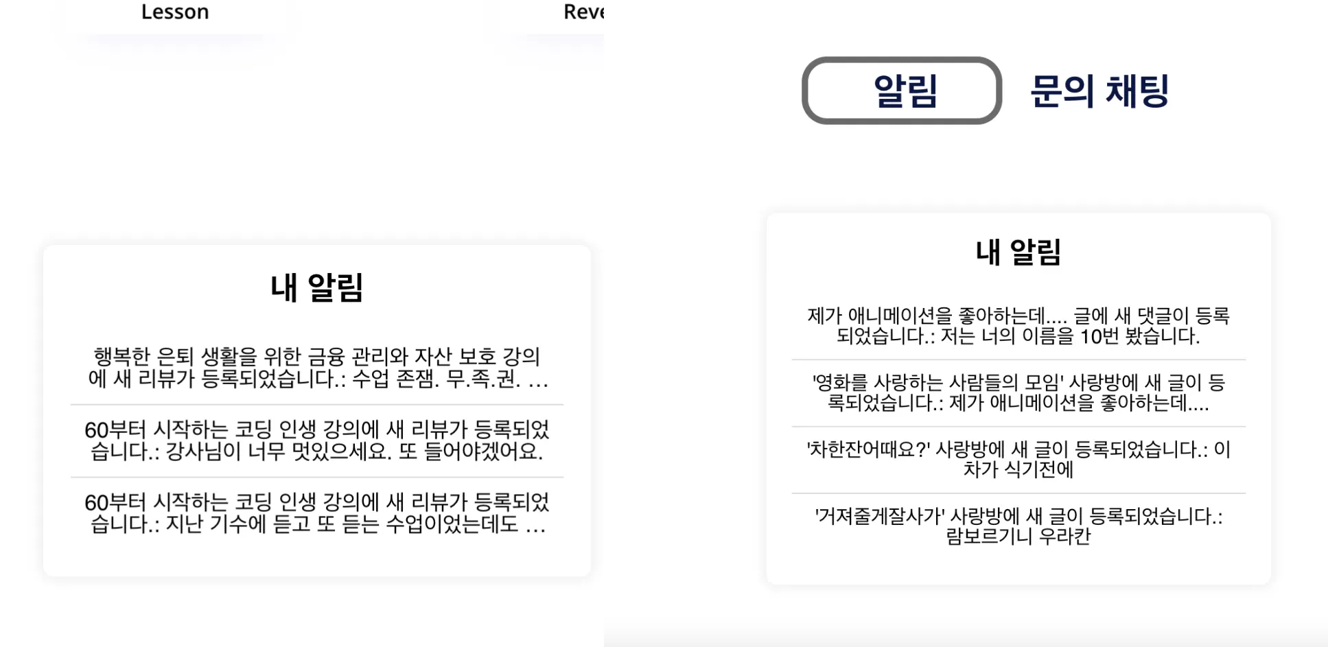 오프라인 수업뿐 아니라 온라인에서도 빠르고 활발한 소통으로 소셜 활동을 이어 나갈 수 있도록 실시간 알림 기능을 구현했습니다.