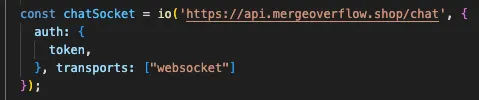 소켓 연결 시 클라이언트는 JWT 토큰을 전달하며, 로드밸런서 환경에서 원활한 연결을 위해 transports는 'websocket' 방식으로 설정합니다.