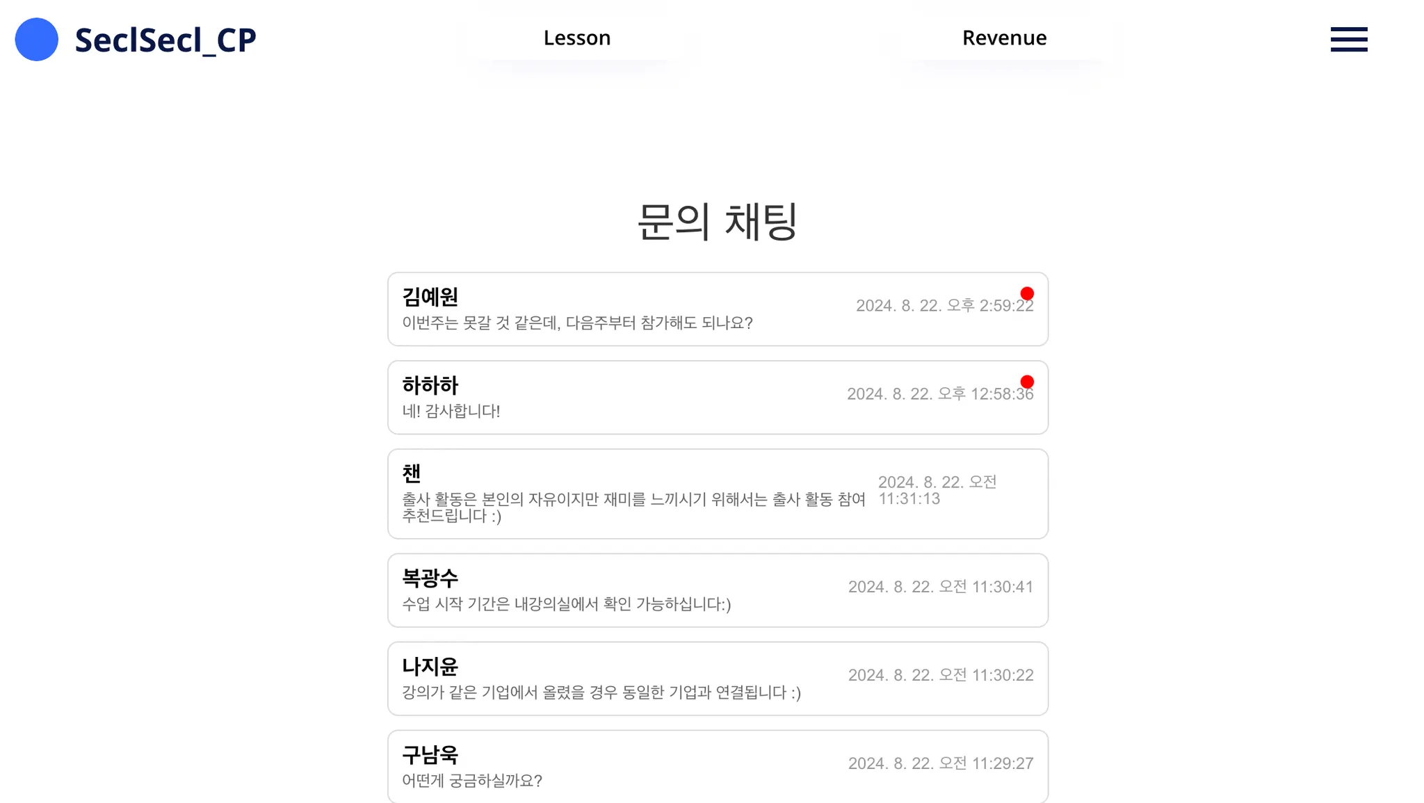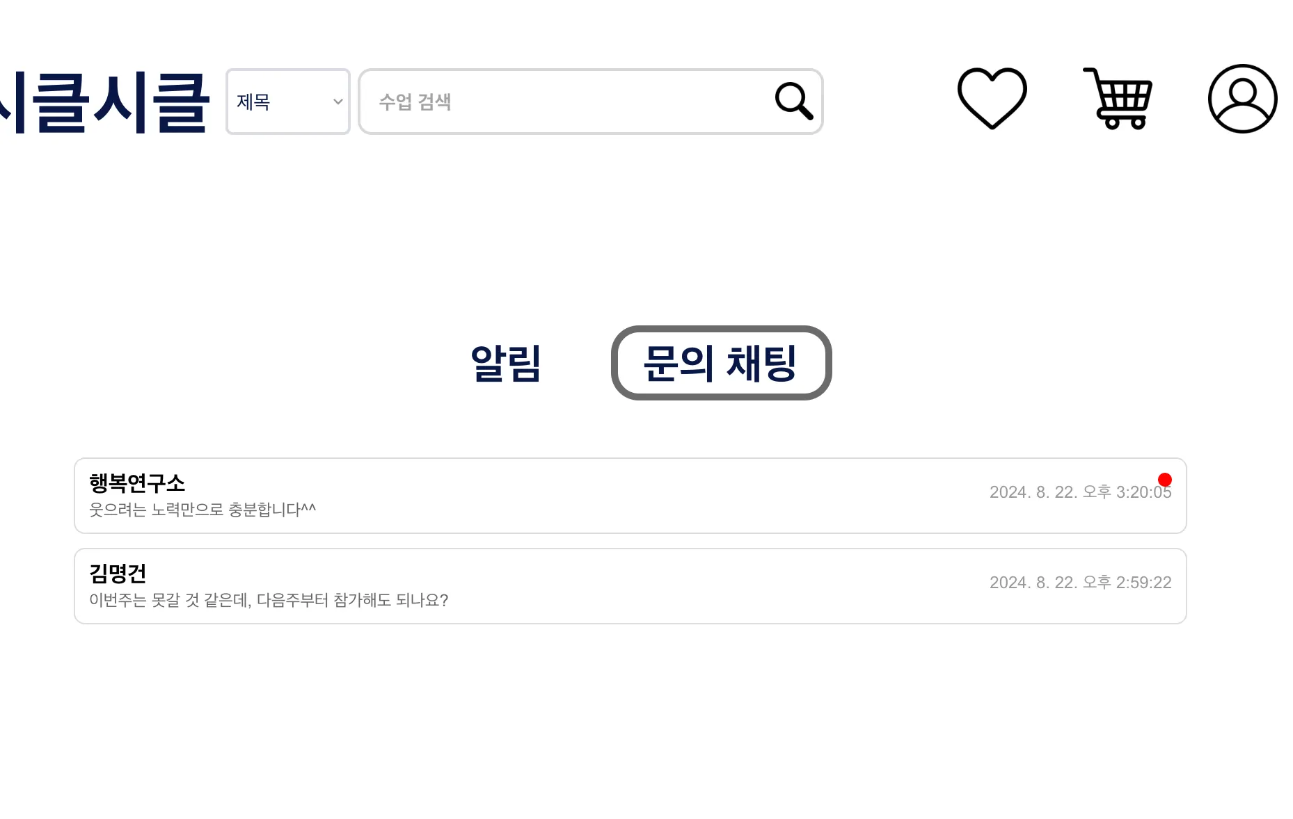 USER와 강의 담당자인 CP 모두 문의 채팅 목록을 통해 자신의 채팅방을 한눈에 볼 수 있습니다.