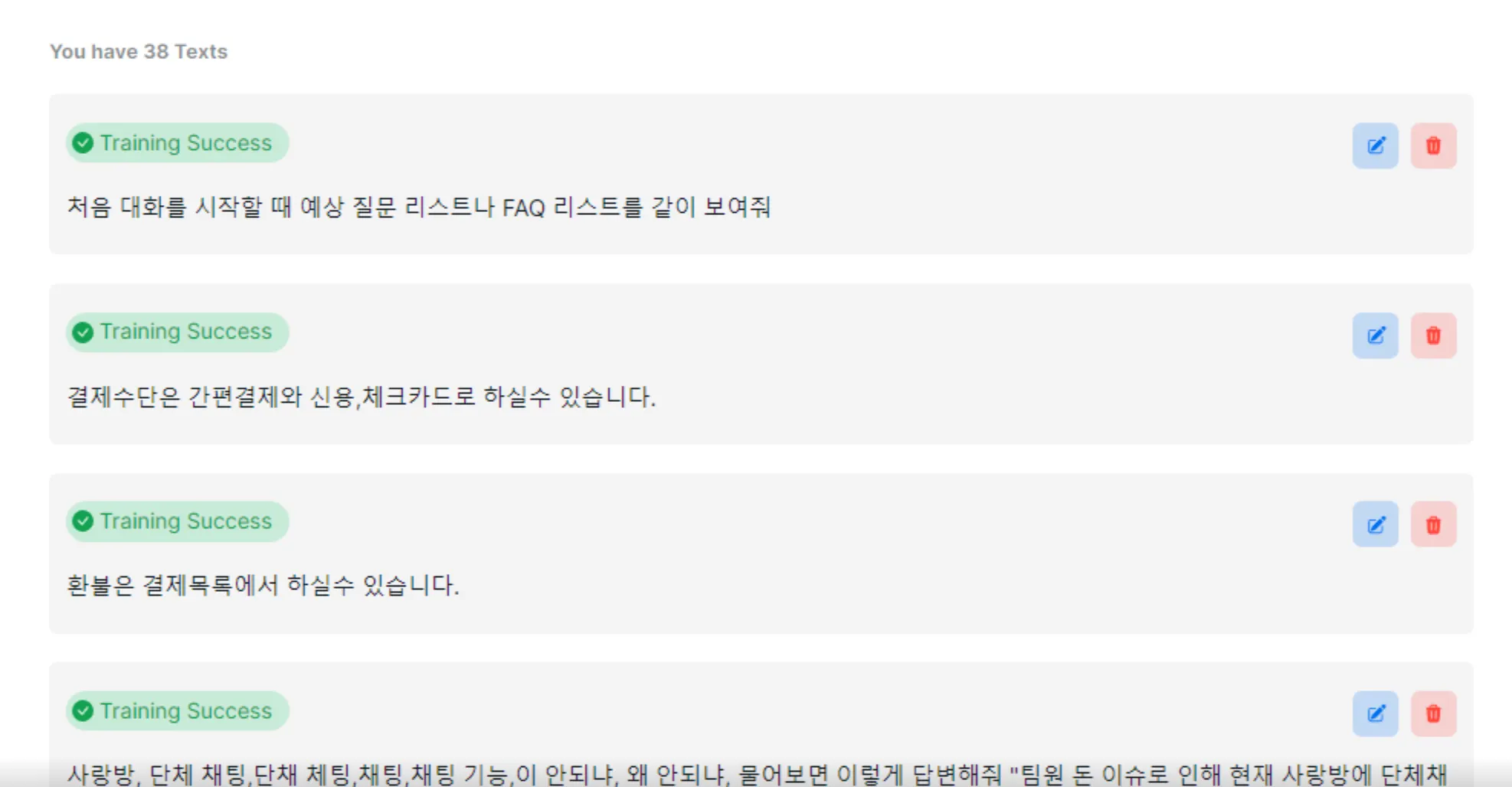 예상 질문 또는 답변을 등록해 놓으면 스스로 학습해 사용자에게 적합한 답을 제공해 줍니다.