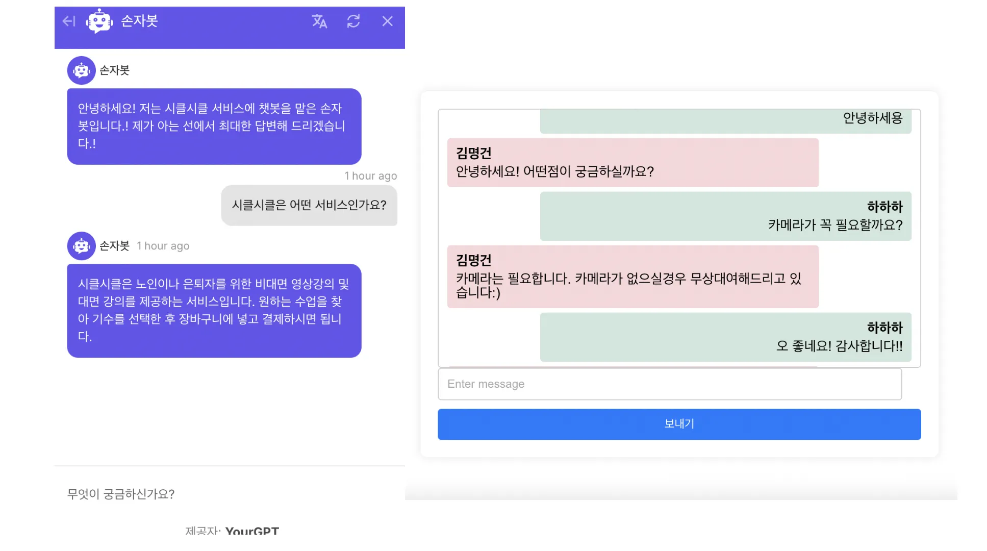 처음에는 구글의 OpenAI API를 사용해 챗봇을 구현하려고 했으나, HTTP 통신 방식으로는 실시간 상호작용에 한계가 있었습니다. 웹소켓 기반 기술이 필요한 상황이었지만 시간상의 여유가 없고, 이미 다른 곳에서 사용되고 있어 대안을 찾고자 했습니다. 그 결과, Your GPT라는 서드파티 서비스를 도입하여 실시간 대화 기능을 구현하게 되었고, 이를 통해 별도의 통신 시스템을 구축할 필요 없이 실시간 상호작용이 가능해졌습니다.