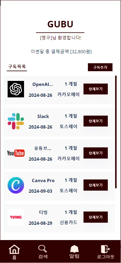 구부의 메인 페이지에서 구독 추가, 자신이 추가한 구독 목록을 간단히 살펴볼 수 있습니다.