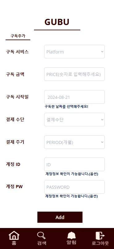구독 추가 시, 구독 중인 플랫폼, 결제금액, 구독 시작일, 결제 수단, 결제 주기, 구독 계정 정보를 입력합니다.