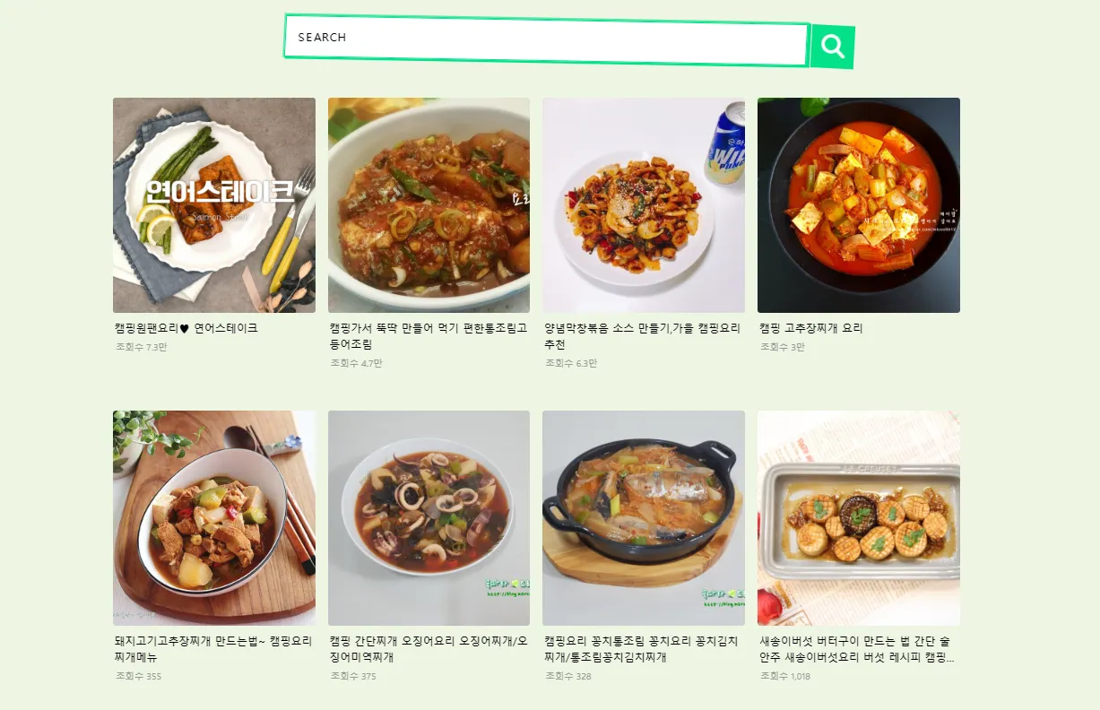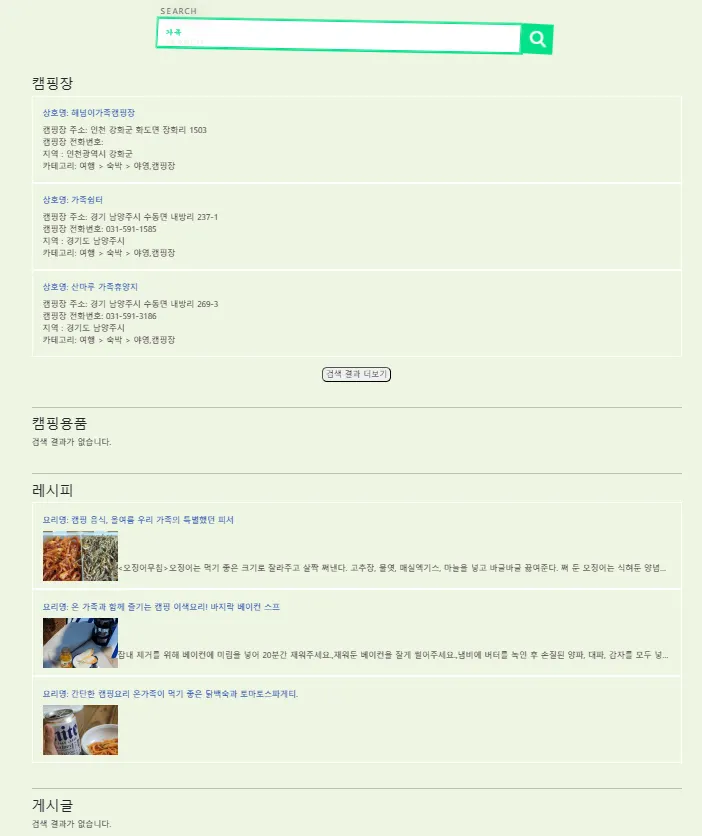 캠핑장, 캠핑 용품, 레시피, 게시글 전체 통합 검색 가능