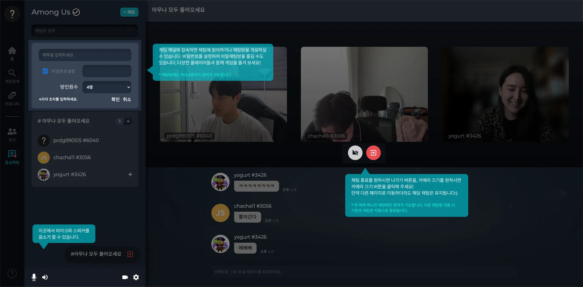 고현석 | socket.io 백앤드 서버 구축,실시간 팀 텍스트, 화상채팅기능. 방생성, 설정기능, 메인페이지 활성화된 채널 기능 |
