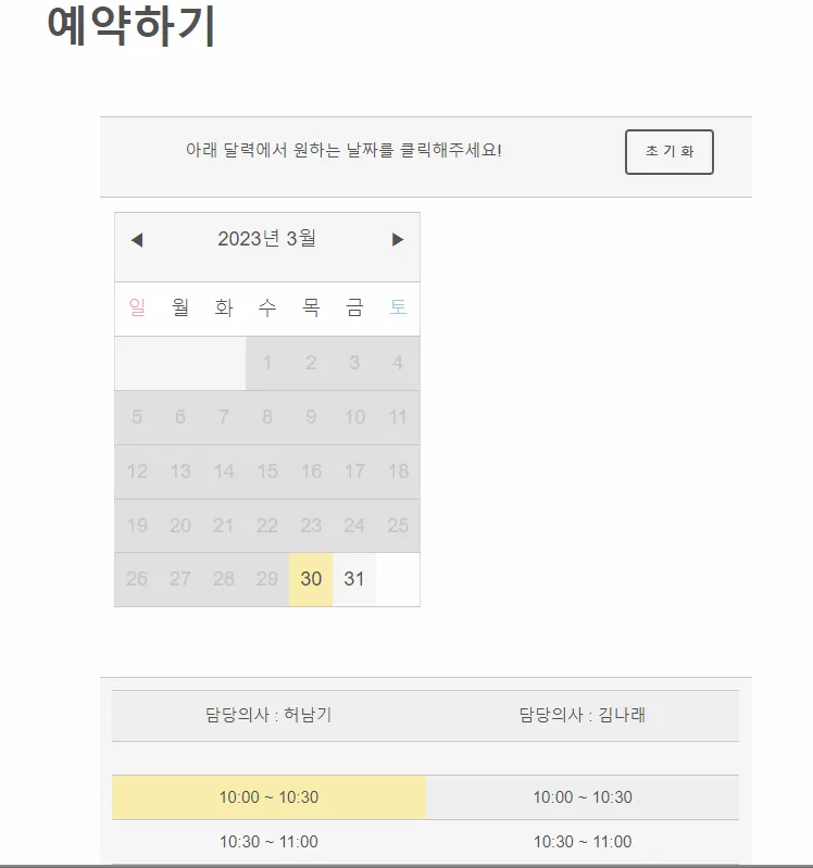 해당 병원에 예약 가능한 날짜, 의사, 시간을 선택하여 예약을 진행할 수 있습니다.