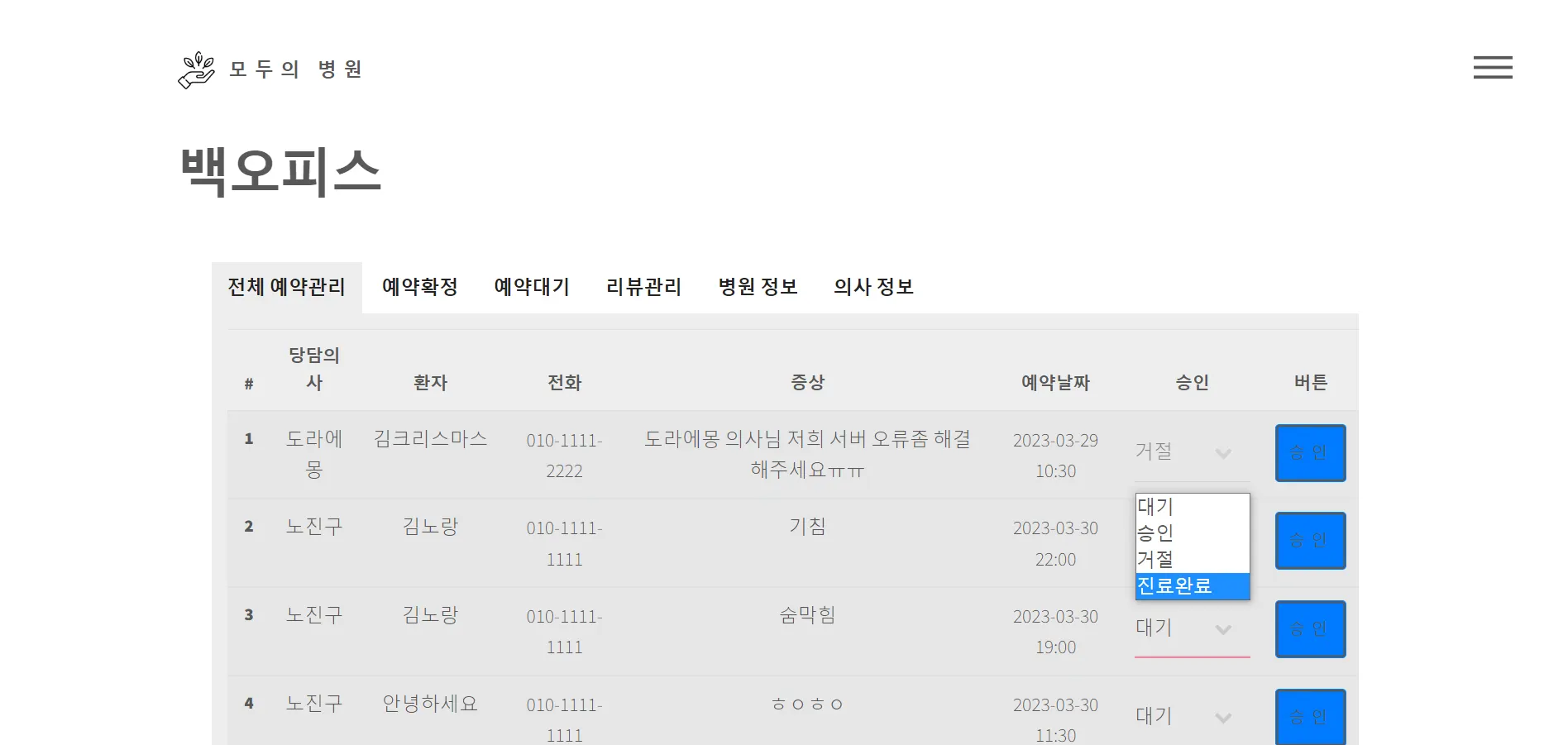 병원 측 예약 관리 시스템