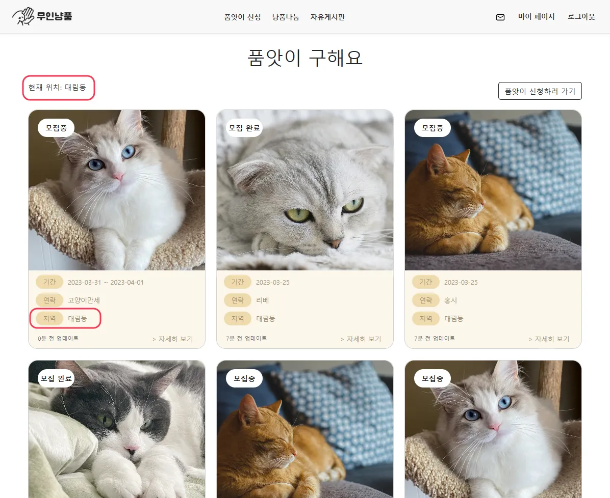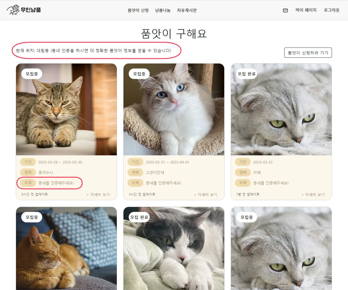 우리 동네 위치 기반, 고양이 돌봄 품앗이 서비스