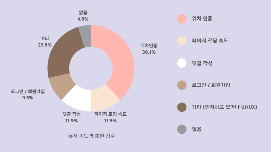 ‘무엇이 불편하였나요’ 항목에 위치 인증을 진행하였으나 진행되지 않아 이상하였다 항목이 전체 (26개) 응답 중 38.1%로 비교적 높았다. 그래서 트러블 슈팅 진행