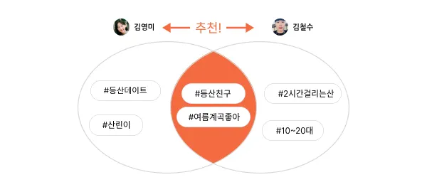 회원가입할 때 고른 해시태그를 비교하여 하나 이상 겹칠 경우 추천 친구로 노출됩니다.