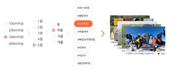 산 높이, 점수, 추천계절, 해시태그 등 다양한 조건으로 필터링 조회를 구현했습니다.